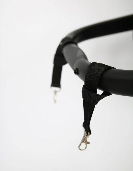 Komplekte yra 2 tvirtinimo dirželiai prie vežimėlio rankenos.